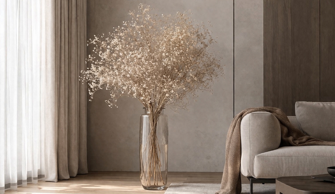 Одно из главных преимуществ гипсофилы — она идеально подходит для создания интерьерных композиций, которые не завянут никогда. Высушенные веточки сохраняют форму и нежный оттенок месяцами, а иногда и годами.
