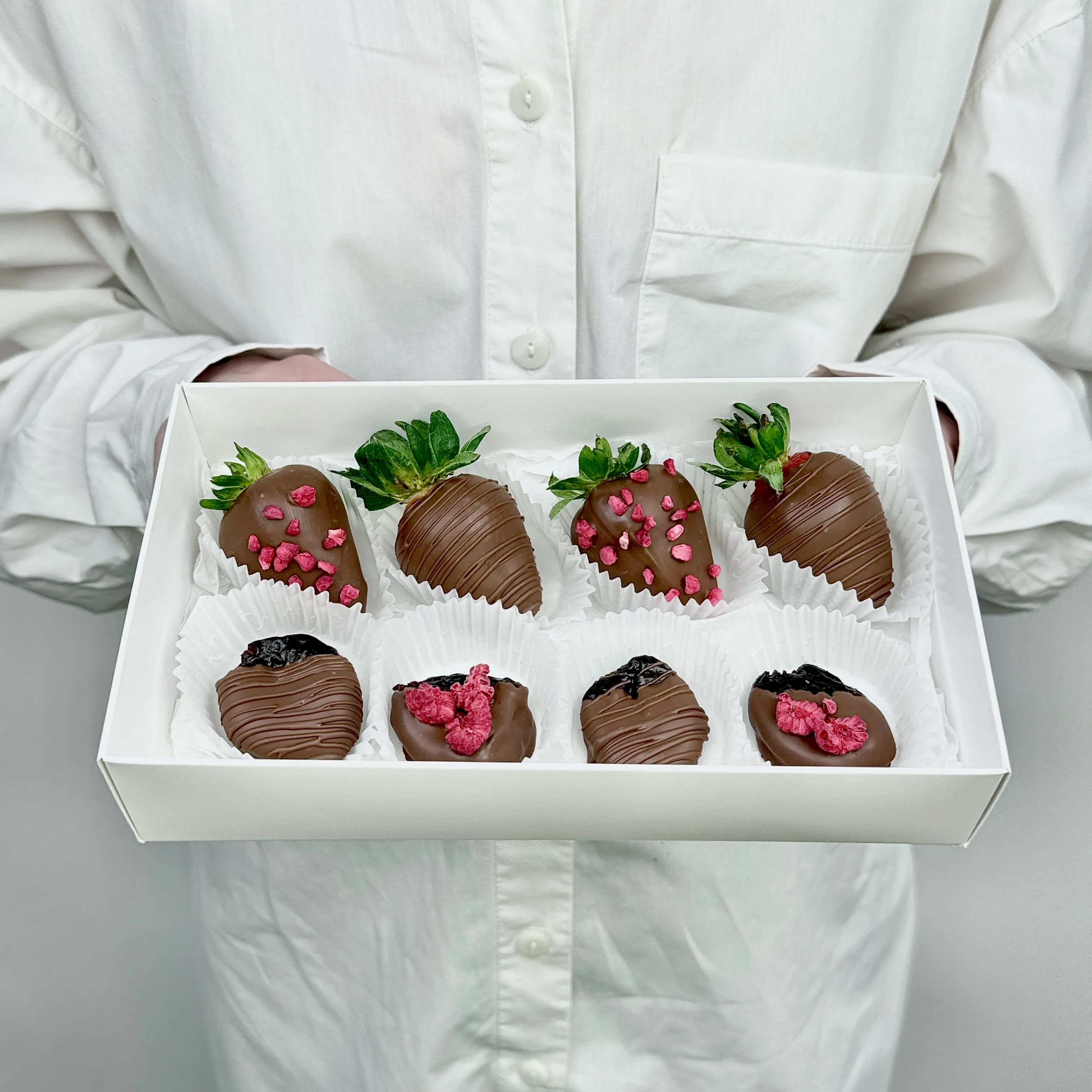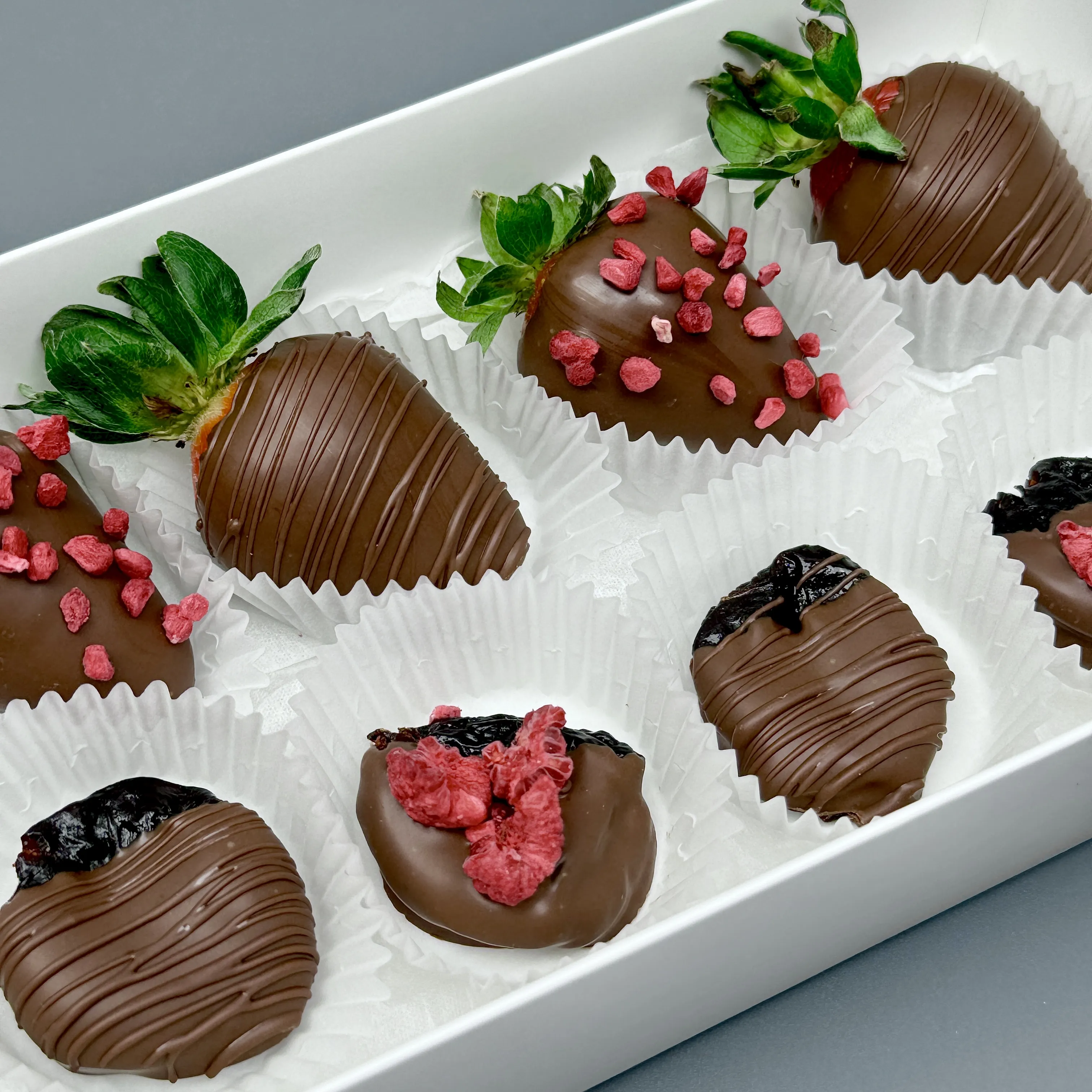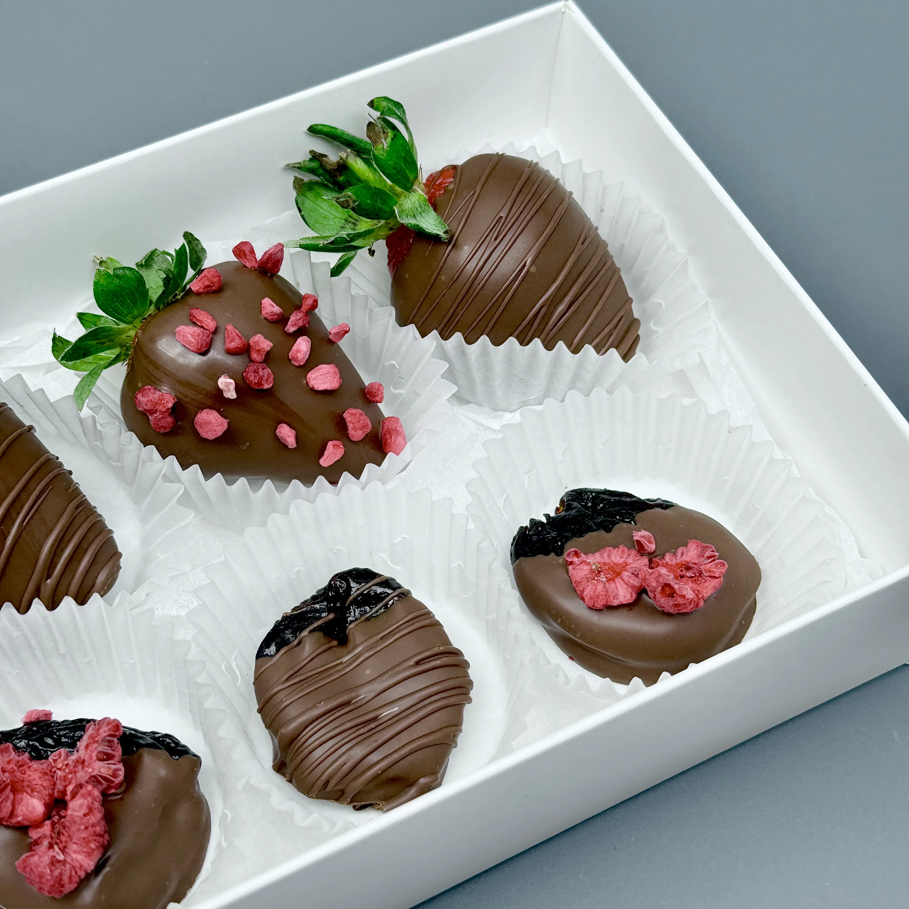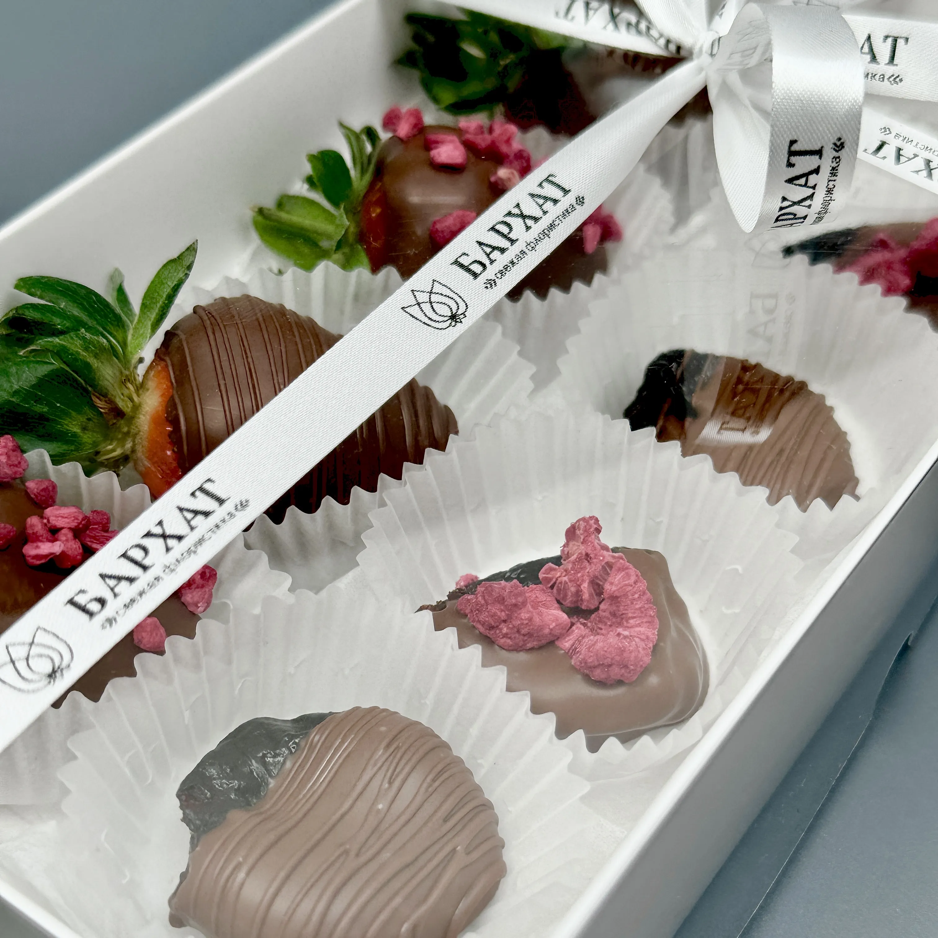 Состав: клубника в шоколаде 4 шт., чернослив в шоколаде 4 шт. с сублимированной малиной.  НОВИНКА! Прекрасная возможность попробовать сразу два изысканных вкуса в одной коробочке! Классическое сочетание нежной клубники в фирменном шоколаде с новым вкусом: сочный чернослив в благородном шоколаде. Чернослив - чемпион по содержанию антиоксидантов. Для сравнения, второе место занимает изюм с показателем в 2 раза ниже. Это настоящий anti-age десерт, сохраняющий ваше здоровье и молодость. Стильная открытка-инструкция в качестве бесплатного бонуса. Отличный подарок бабушке, маме, любимой женщине, жене, мужу, брату, дедушке, подруге, сестре, друзьям и коллеге.