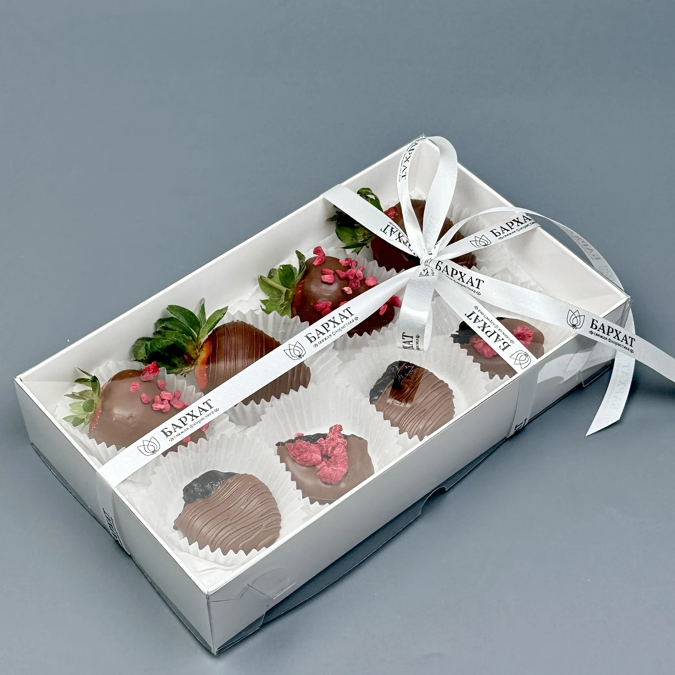 Мы собираем клубничные букеты по весу, а не по штукам. Количество, форма и размер ягод могут отличаться — ведь каждая ягода уникальна.