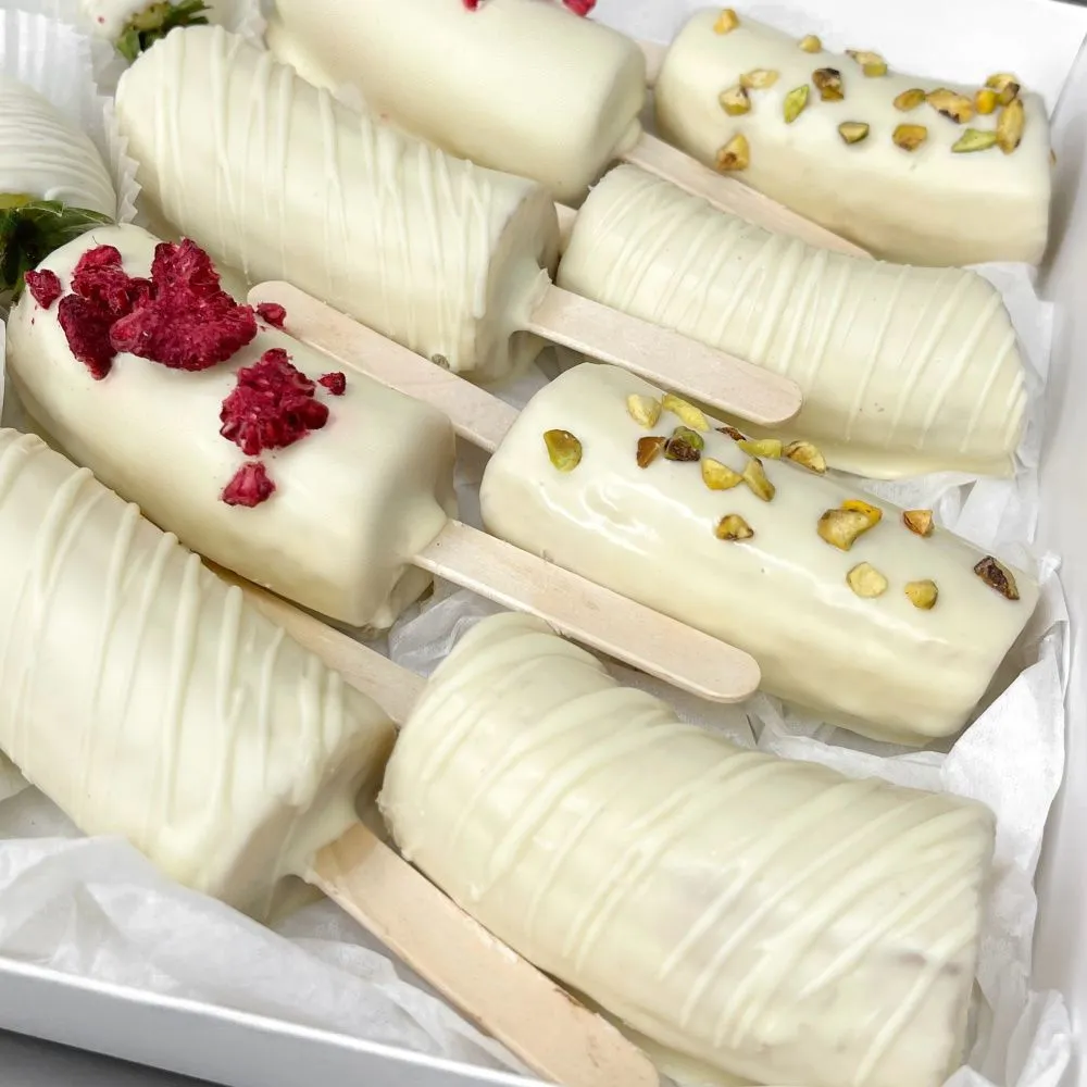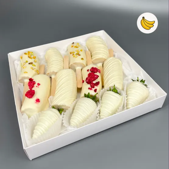 Состав: бананы в шоколаде 8 шт., клубника в шоколаде 4 шт. Свежие бананы в бельгийском шоколаде — идеальный способ выразить чувства: ко дню рождения, годовщине, 8 Марта, 14 Февраля, Дню матери, Дню учителя, Дню бабушки и дедушки или просто в знак внимания и заботы. Фирменная открытка-инструкция по хранению — в подарок. Коробочка бананов в шоколаде — отличный подарок бабушке, маме, любимой женщине, жене, подруге, сестре, друзьям и коллеге.