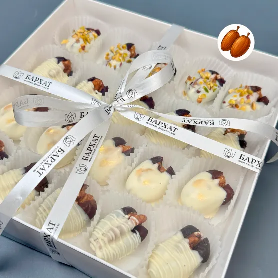 Состав: финики 20 шт. в белом шоколаде, с добавлением грецкого ореха и измельченной фисташки.
