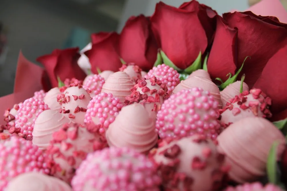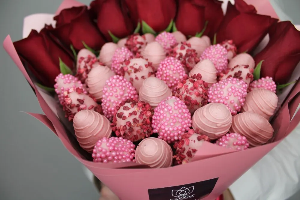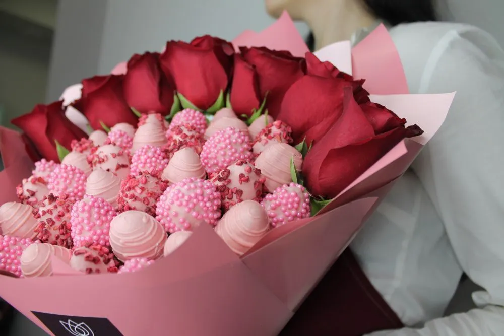 Мы собираем клубничные букеты по весу, а не по штукам. Количество, форма и размер ягод могут отличаться — ведь каждая ягода уникальна.