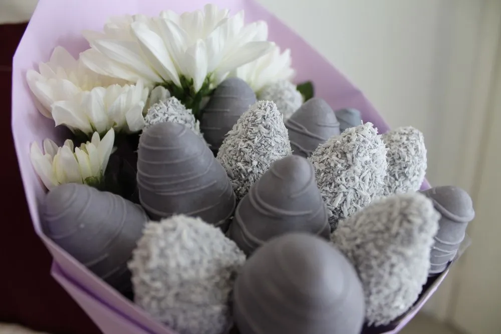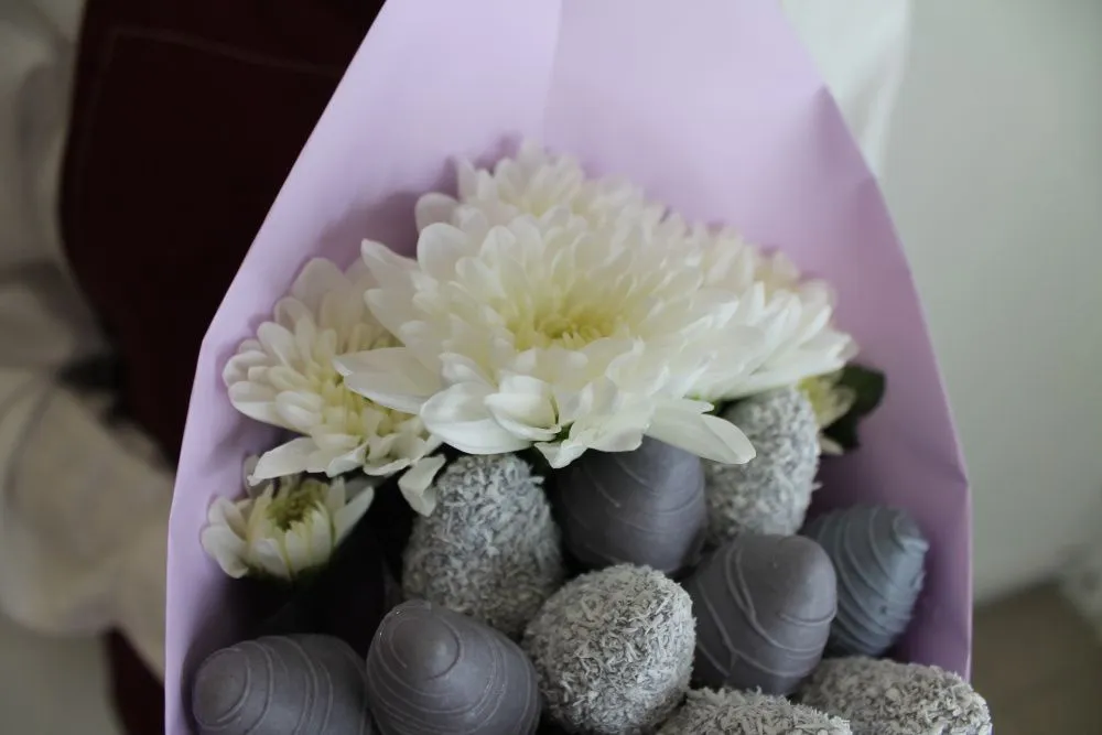Мы собираем клубничные букеты по весу, а не по штукам. Количество, форма и размер ягод могут отличаться — ведь каждая ягода уникальна.