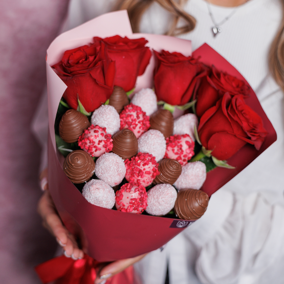 Мы собираем клубничные букеты по весу, а не по штукам. Количество, форма и размер ягод могут отличаться — ведь каждая ягода уникальна.