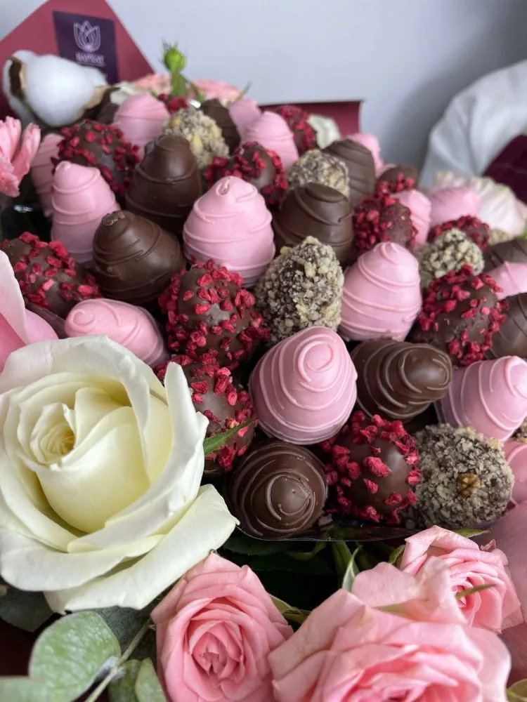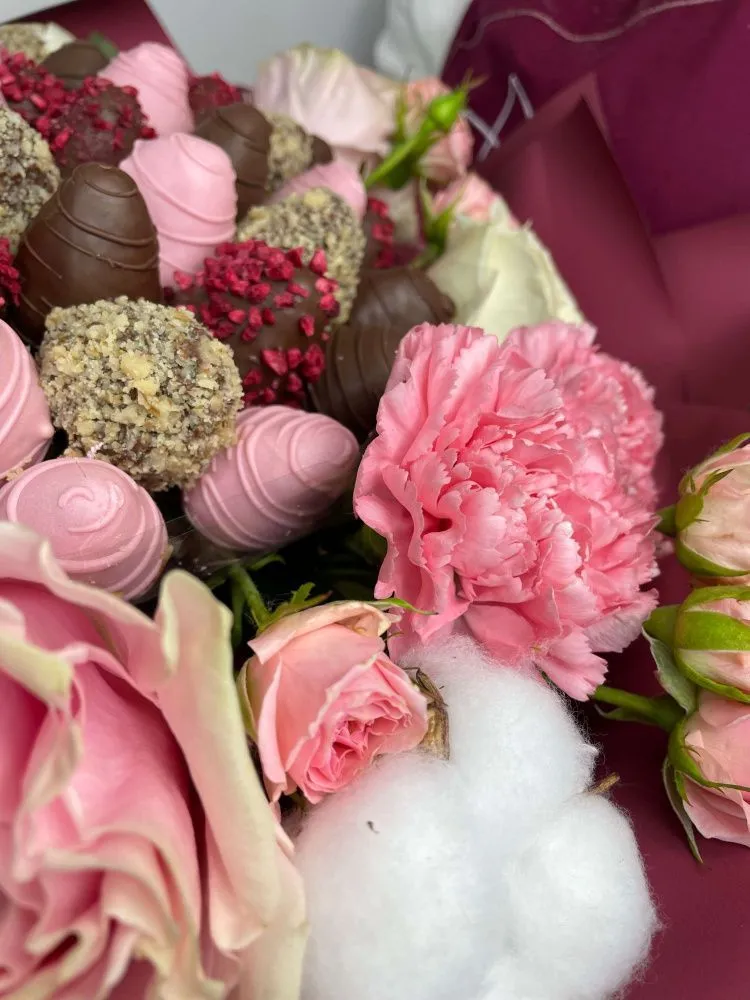 Мы собираем клубничные букеты по весу, а не по штукам. Количество, форма и размер ягод могут отличаться — ведь каждая ягода уникальна.