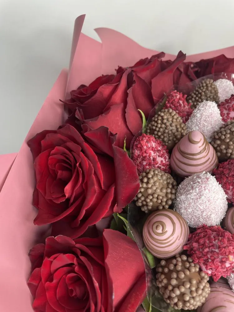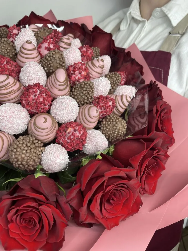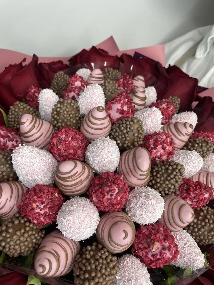 Клубника в шоколаде, Роза одноголовая, Посыпка: Сублимированная малина, Посыпка: Кокосовая стружка, Посыпка: Рисовые шарики