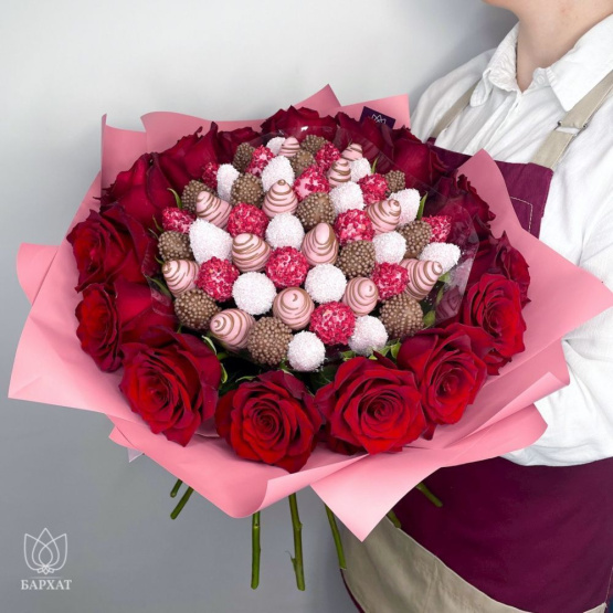 Букет из свежей клубники в бельгийском шоколаде и живых цветов. Клубника держится на каркасе из шпажек. Ягода отделена от цветов прозрачной пленкой. Готовый букет упаковывается в прозрачную слюду.