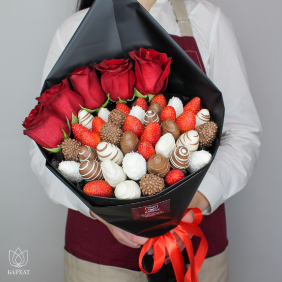 Букет из свежей клубники в бельгийском шоколаде и живых цветов. Клубника держится на каркасе из шпажек. Ягода отделена от цветов прозрачной пленкой. Готовый букет упаковывается в прозрачную слюду.
