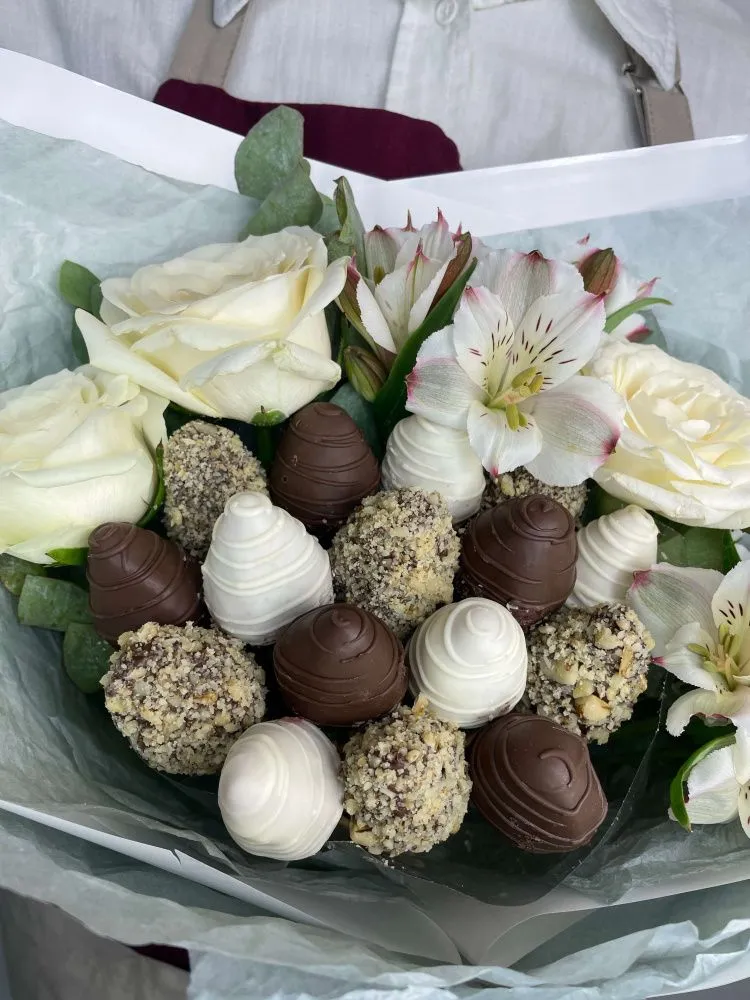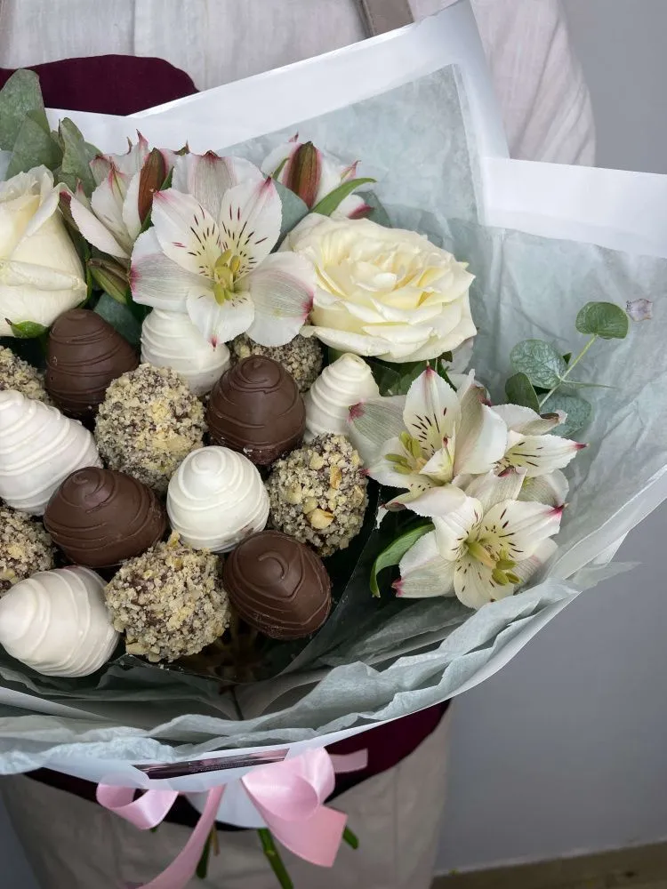 Мы собираем клубничные букеты по весу, а не по штукам. Количество, форма и размер ягод могут отличаться — ведь каждая ягода уникальна.