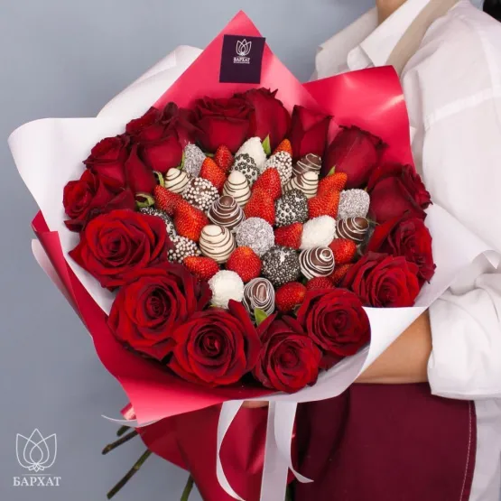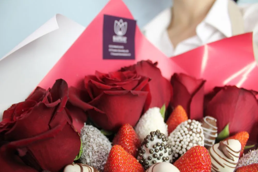 Мы собираем клубничные букеты по весу, а не по штукам. Количество, форма и размер ягод могут отличаться — ведь каждая ягода уникальна.