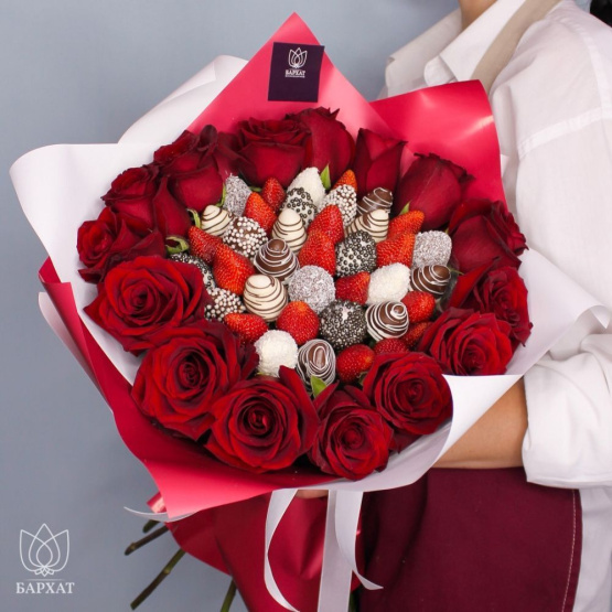 Этот букет — идеальный способ выразить чувства: ко дню рождения, годовщине, 8 Марта, 14 Февраля, Дню матери, Дню учителя, Дню бабушки и дедушки или просто в знак внимания и заботы. Букет из клубники и цветов — съедобный букет — отличный подарок бабушке, маме, любимой женщине, жене, подруге, сестре, друзьям и коллеге.