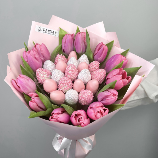 Состав: клубника в шоколаде 220 г, тюльпан 13 шт.