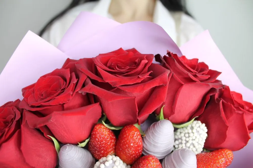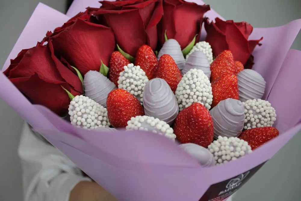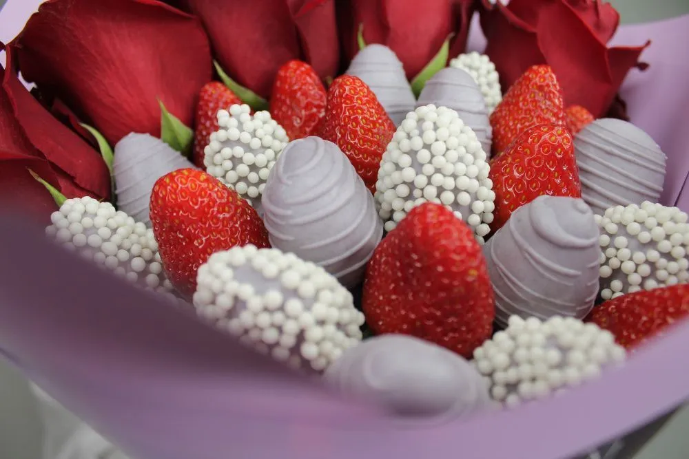 Мы собираем клубничные букеты по весу, а не по штукам. Количество, форма и размер ягод могут отличаться — ведь каждая ягода уникальна.