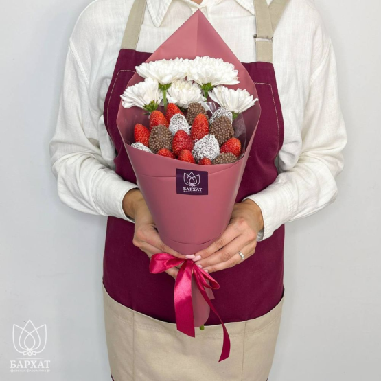 Букет из свежей клубники в бельгийском шоколаде и живых цветов. Клубника держится на каркасе из шпажек. Ягода отделена от цветов прозрачной пленкой. Готовый букет упаковывается в прозрачную слюду. Фирменная открытка-инструкция по хранению — в подарок. Этот букет — идеальный способ выразить чувства: ко дню рождения, годовщине, 8 Марта, 14 Февраля, Дню матери, Дню учителя, Дню бабушки и дедушки или просто в знак внимания и заботы. Букет из клубники и цветов — съедобный букет — отличный подарок бабушке, маме, любимой женщине, жене, подруге, сестре, друзьям и коллеге.