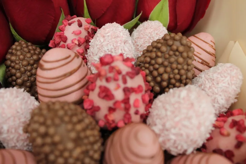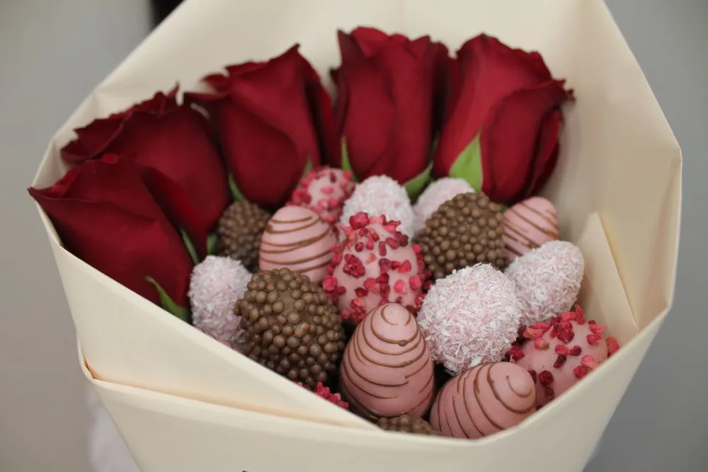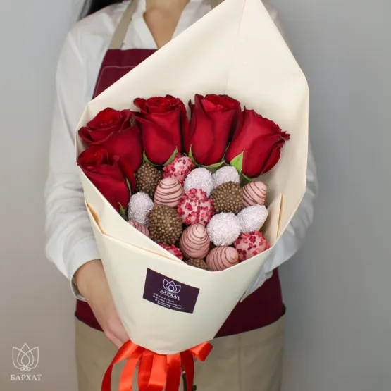 Мы собираем клубничные букеты по весу, а не по штукам. Количество, форма и размер ягод могут отличаться — ведь каждая ягода уникальна.