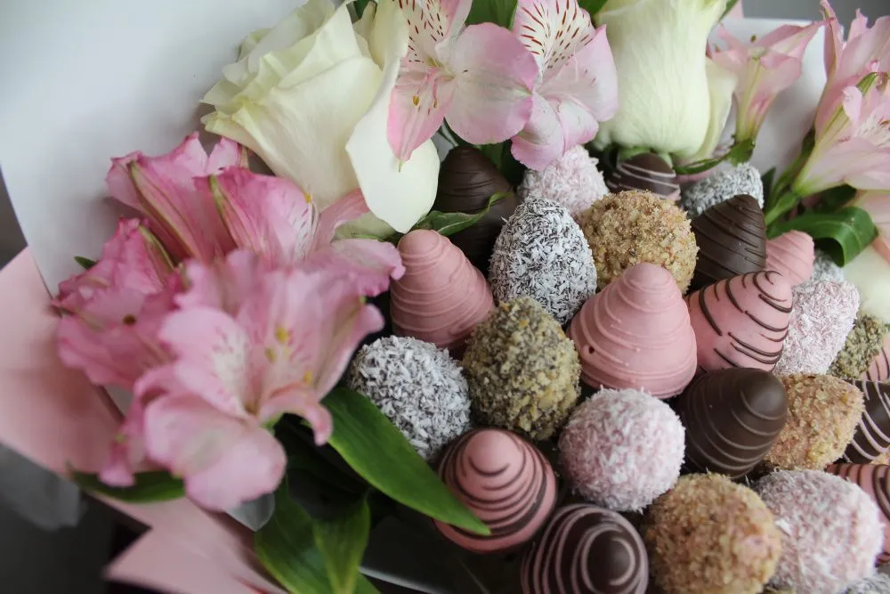 Мы собираем клубничные букеты по весу, а не по штукам. Количество, форма и размер ягод могут отличаться — ведь каждая ягода уникальна.