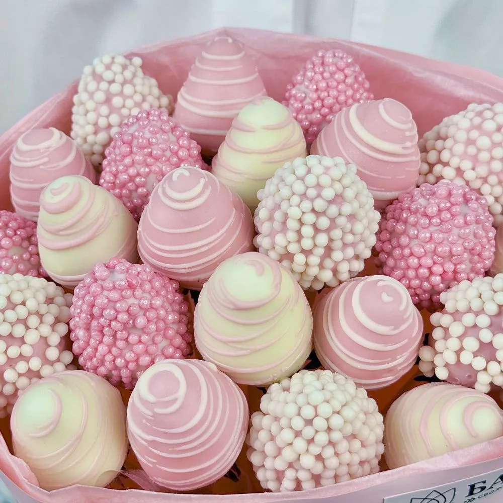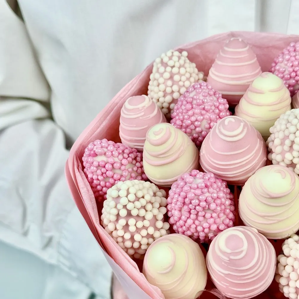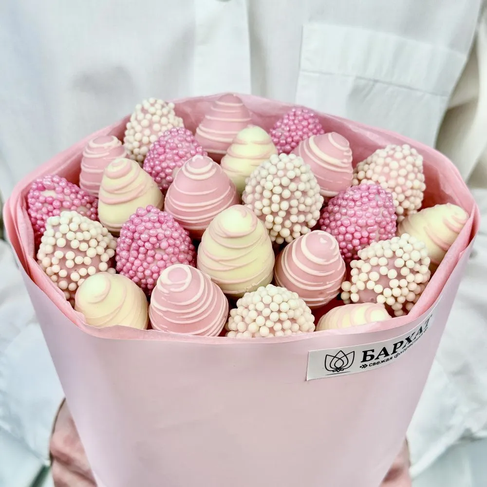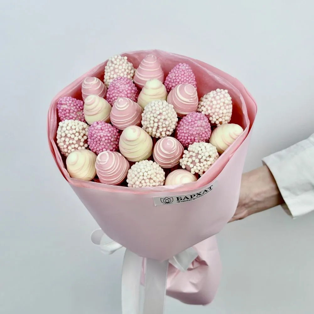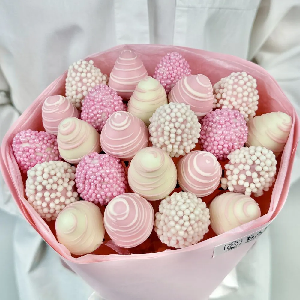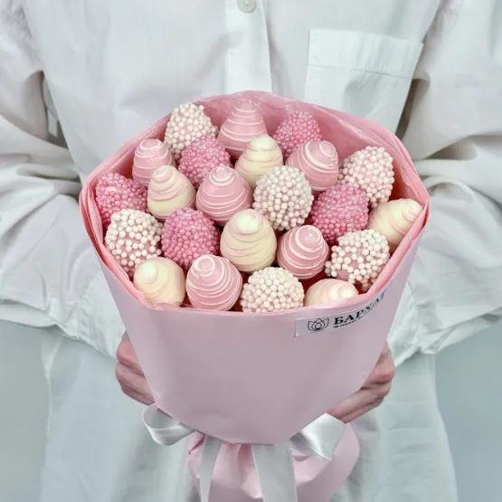 Мы собираем клубничные букеты по весу, а не по штукам. Количество, форма и размер ягод могут отличаться — ведь каждая ягода уникальна.