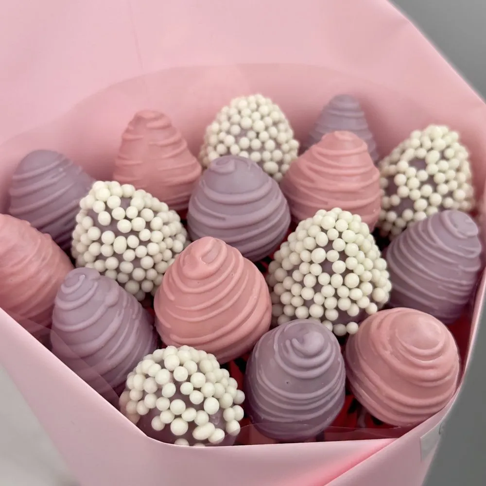 Мы собираем клубничные букеты по весу, а не по штукам. Количество, форма и размер ягод могут отличаться — ведь каждая ягода уникальна.