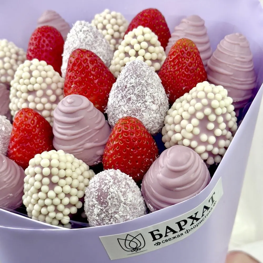 Мы собираем клубничные букеты по весу, а не по штукам. Количество, форма и размер ягод могут отличаться — ведь каждая ягода уникальна.