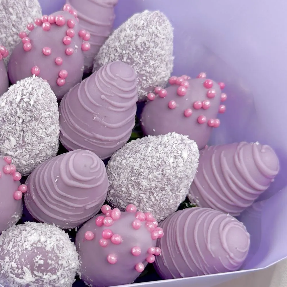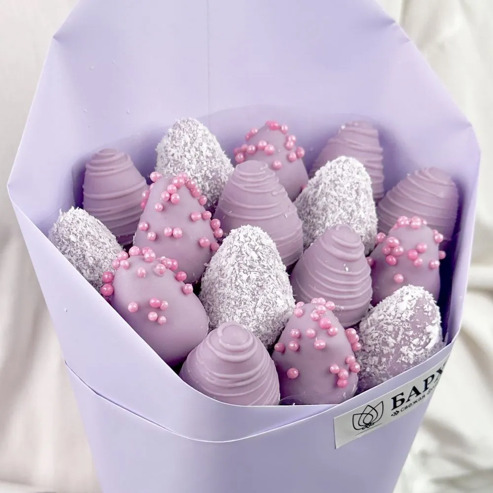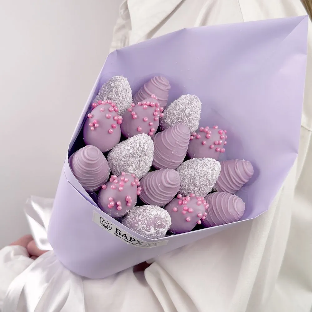 Мы собираем клубничные букеты по весу, а не по штукам. Количество, форма и размер ягод могут отличаться — ведь каждая ягода уникальна.