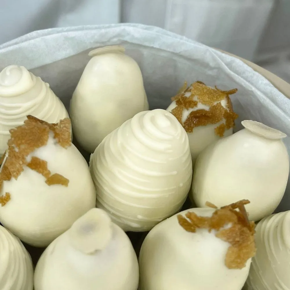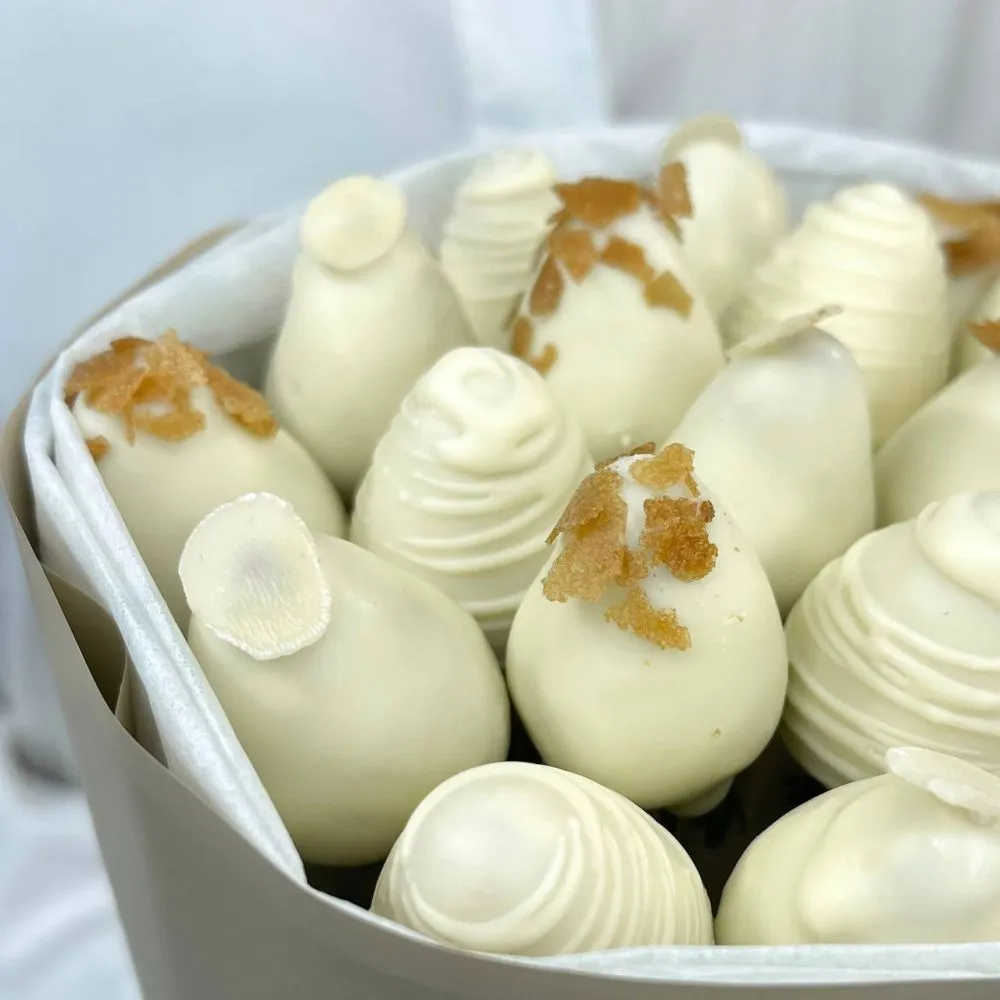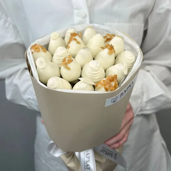 Мы собираем клубничные букеты по весу, а не по штукам. Количество, форма и размер ягод могут отличаться — ведь каждая ягода уникальна.