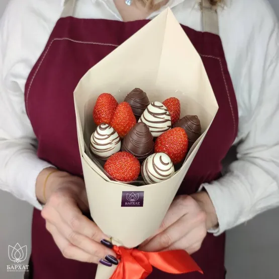 Мы собираем клубничные букеты по весу, а не по штукам. Количество, форма и размер ягод могут отличаться — ведь каждая ягода уникальна.