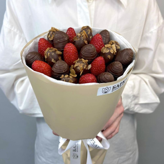 *Обратите внимание: изображение в карточке товара носит иллюстративный характер — реальный букет может незначительно отличаться от фото (например, по размеру клубники, форме и сборке). Точные размеры букета указаны в карточке товара.