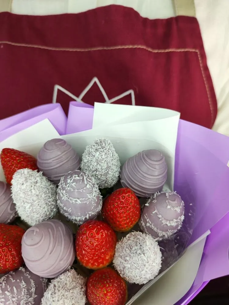 Мы собираем клубничные букеты по весу, а не по штукам. Количество, форма и размер ягод могут отличаться — ведь каждая ягода уникальна.