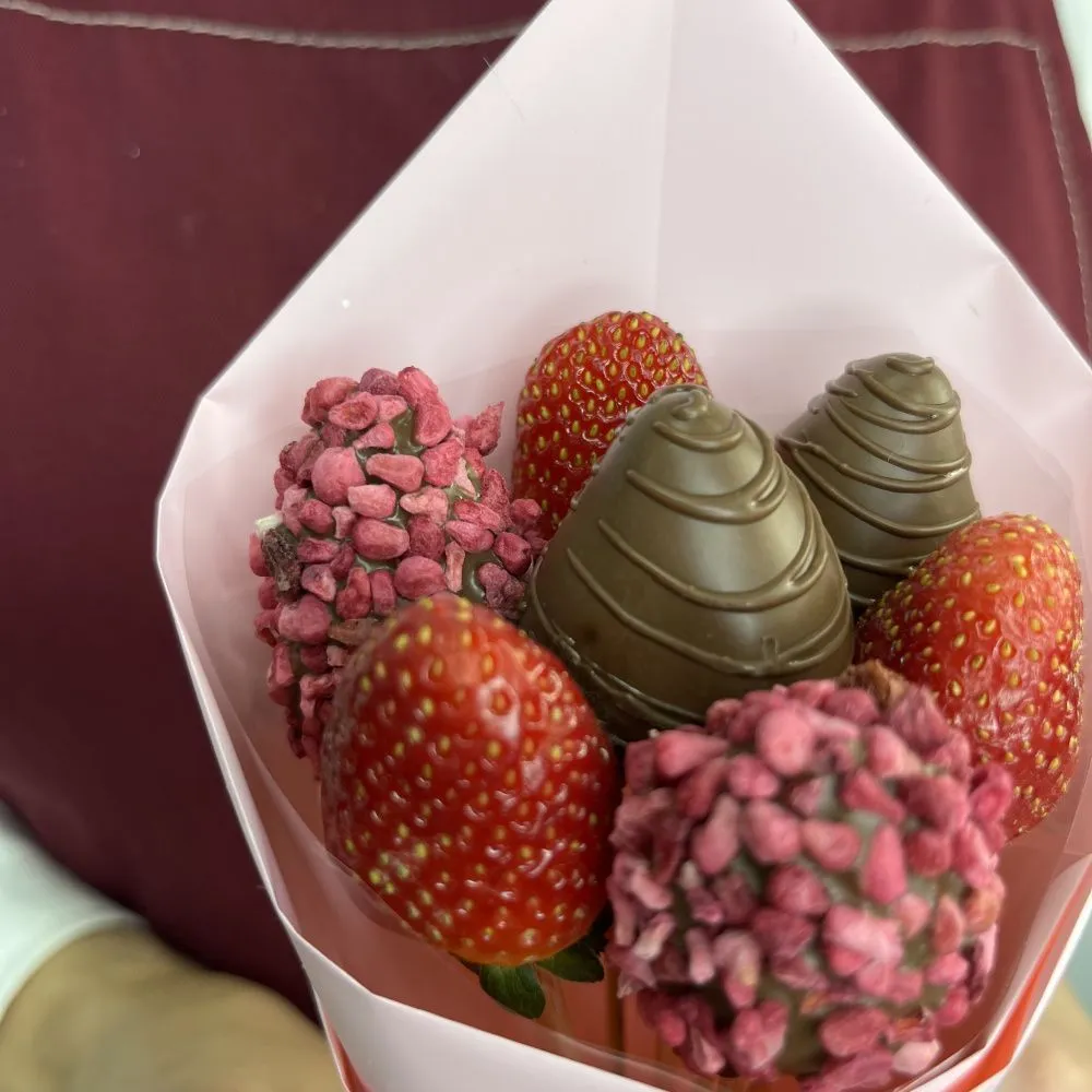 Мы собираем клубничные букеты по весу, а не по штукам. Количество, форма и размер ягод могут отличаться — ведь каждая ягода уникальна.