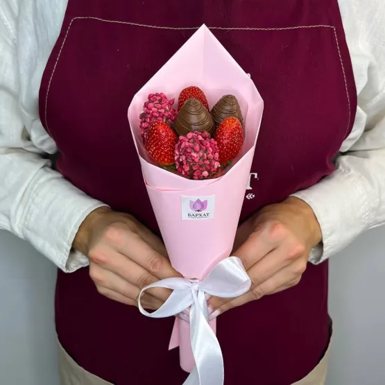 Букет из свежей клубники в бельгийском шоколаде. Клубника держится на каркасе из шпажек. Готовый букет упаковывается в прозрачную слюду. Фирменная открытка-инструкция по хранению — в подарок. Этот букет — идеальный способ выразить чувства: ко дню рождения, годовщине, 8 Марта, 14 Февраля, Дню матери, Дню учителя, Дню бабушки и дедушки или просто в знак внимания и заботы. Букет из клубники — съедобный букет — отличный подарок бабушке, маме, любимой женщине, жене, подруге, сестре, друзьям и коллеге.