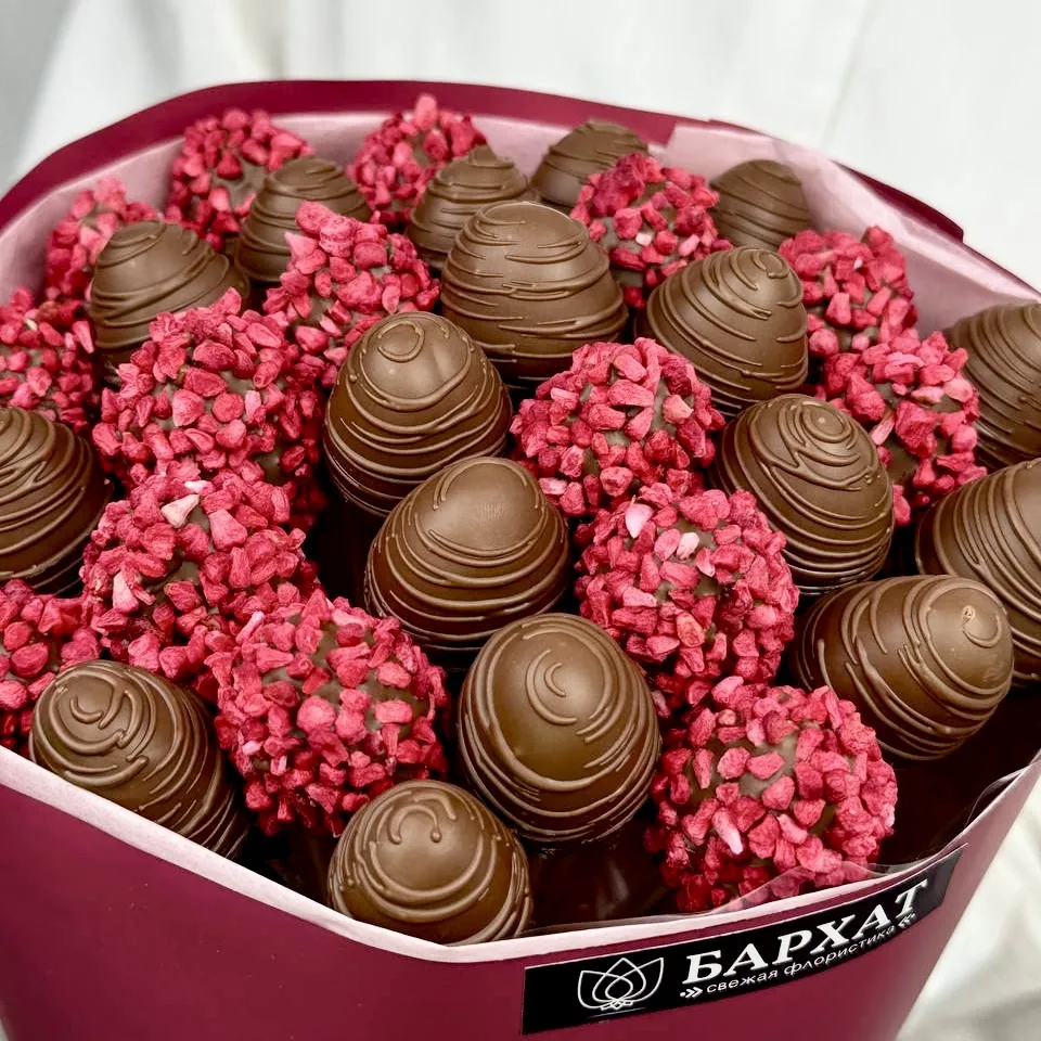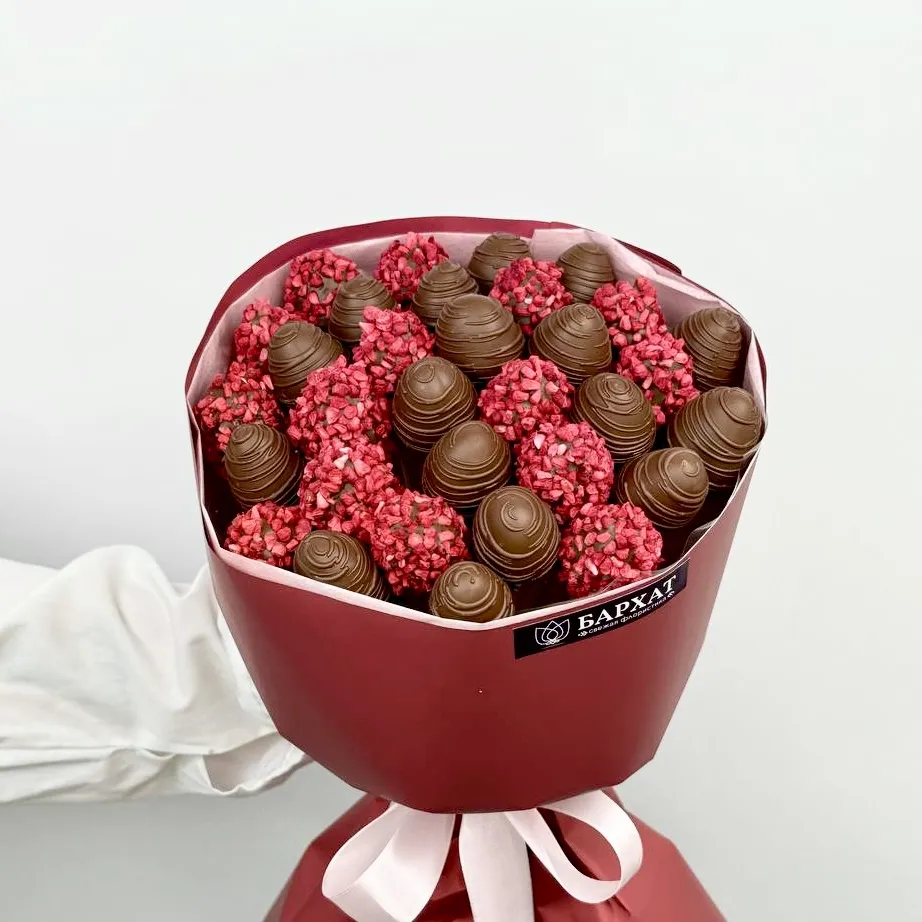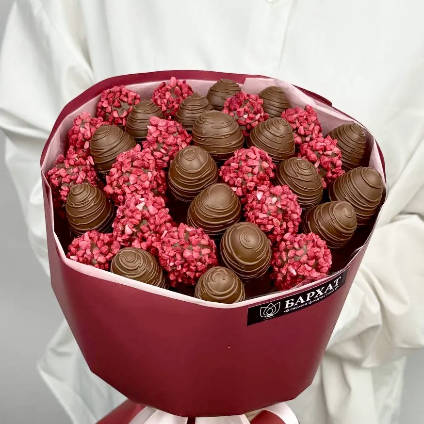 Состав: клубника в шоколаде 300 г. Букет из свежей клубники в бельгийском шоколаде. Клубника держится на каркасе из шпажек. Готовый букет упаковывается в прозрачную слюду. Фирменная открытка-инструкция по хранению — в подарок. Этот букет — идеальный способ выразить чувства: ко дню рождения, годовщине, 8 Марта, 14 Февраля, Дню матери, Дню учителя, Дню бабушки и дедушки или просто в знак внимания и заботы. Букет из клубники — съедобный букет — отличный подарок бабушке, маме, любимой женщине, жене, подруге, сестре, друзьям и коллеге.