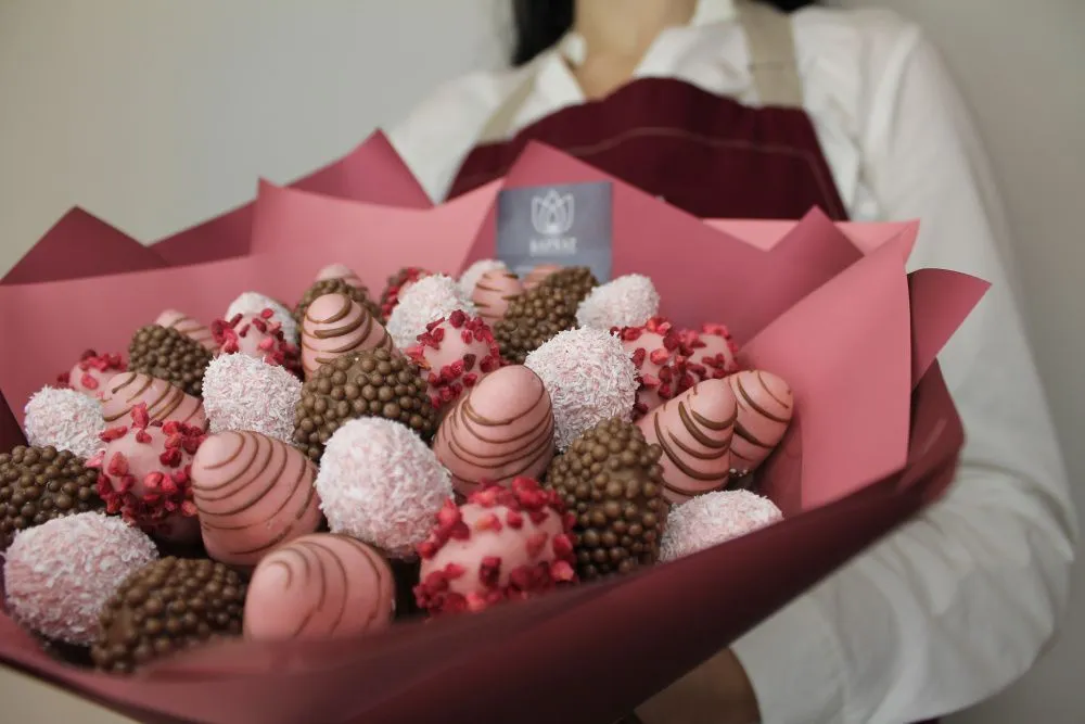 Мы собираем клубничные букеты по весу, а не по штукам. Количество, форма и размер ягод могут отличаться — ведь каждая ягода уникальна.
