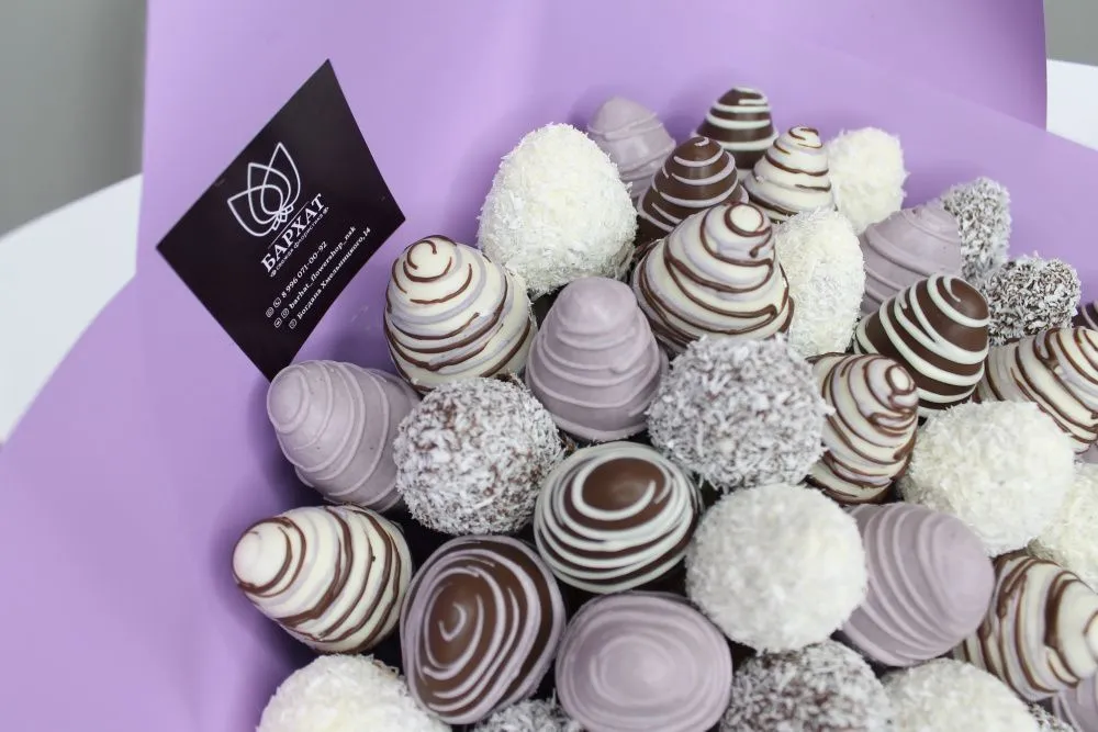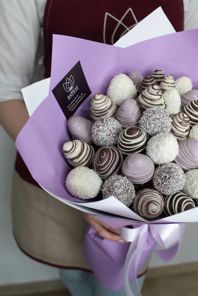 Мы собираем клубничные букеты по весу, а не по штукам. Количество, форма и размер ягод могут отличаться — ведь каждая ягода уникальна.