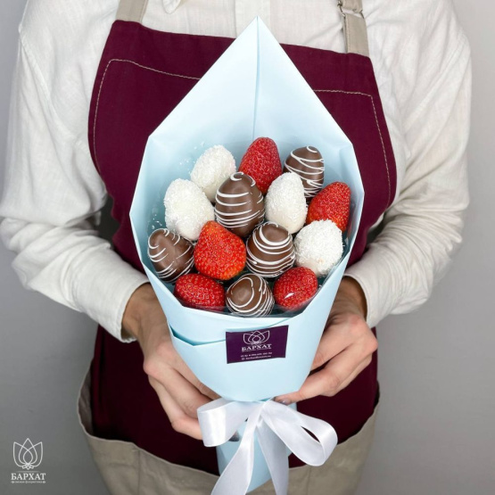 Букет из свежей клубники в бельгийском шоколаде. Клубника держится на каркасе из шпажек. Готовый букет упаковывается в прозрачную слюду.
