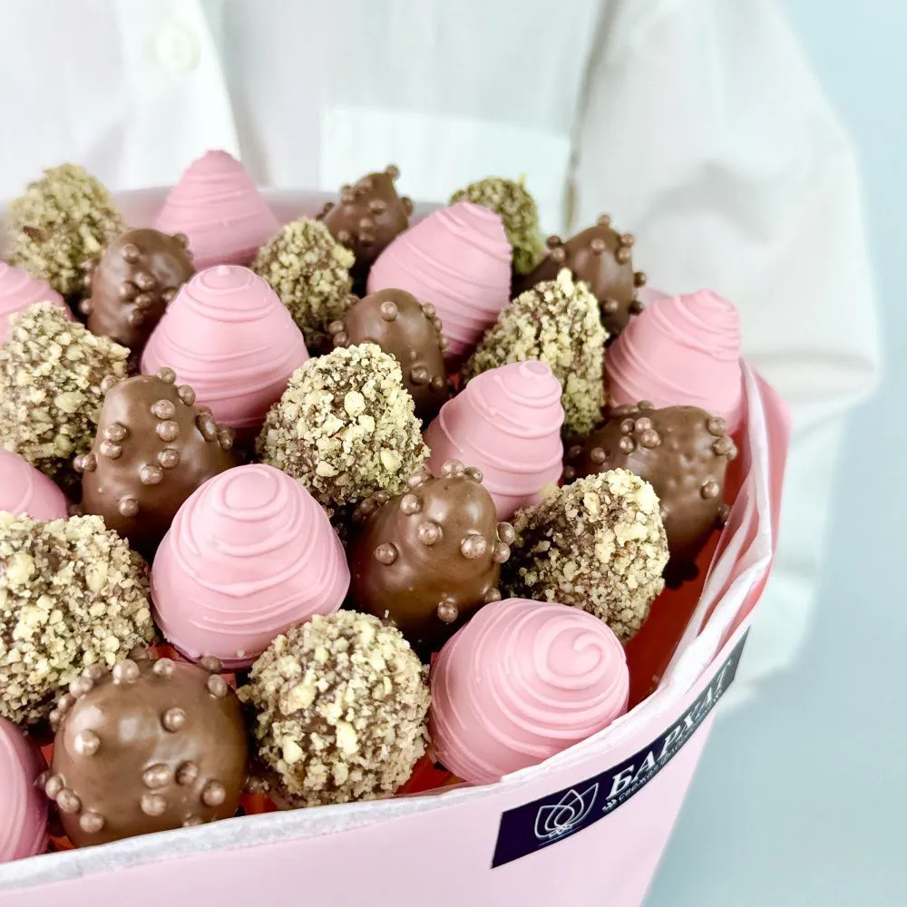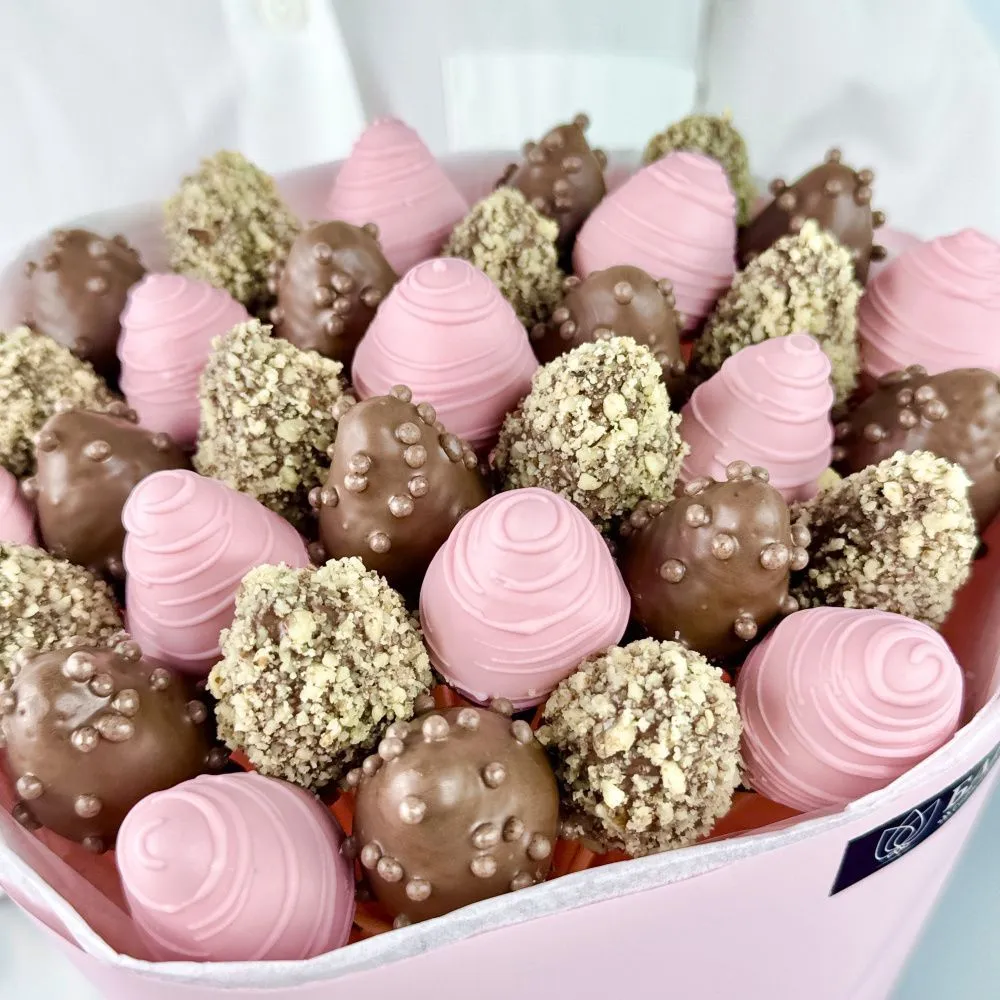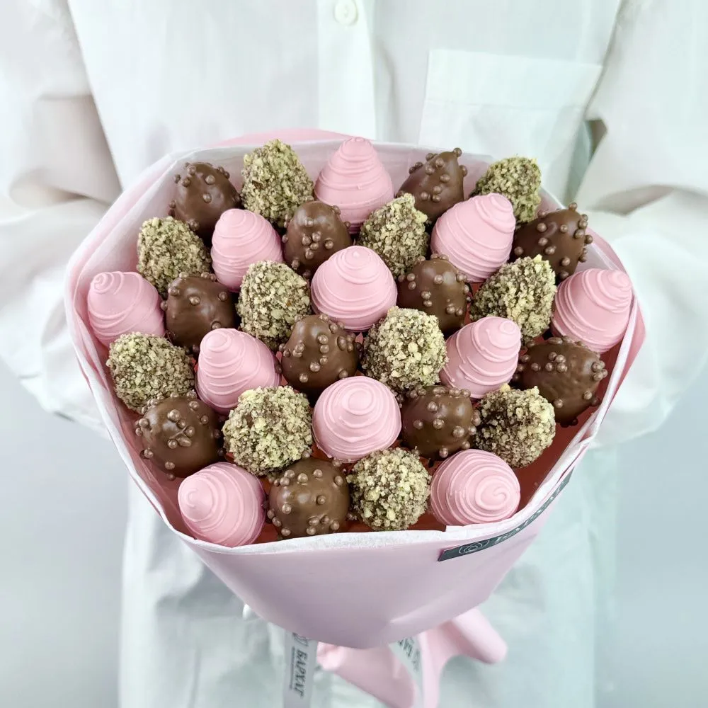 Мы собираем клубничные букеты по весу, а не по штукам. Количество, форма и размер ягод могут отличаться — ведь каждая ягода уникальна.