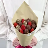 Состав: клубника в шоколаде 110 г, клубника без шоколада 110 г. Букет из свежей клубники в бельгийском шоколаде.