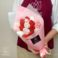 Мы собираем клубничные букеты по весу, а не по штукам. Количество, форма и размер ягод могут отличаться — ведь каждая ягода уникальна.