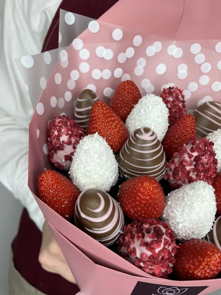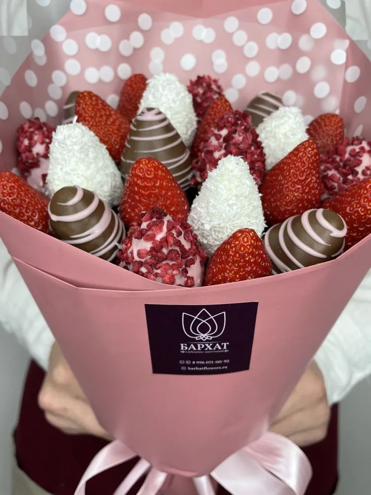 *Обратите внимание: изображение в карточке товара носит иллюстративный характер — реальный букет может незначительно отличаться от фото (например, по размеру клубники, форме и сборке). Точные размеры букета указаны в карточке товара.