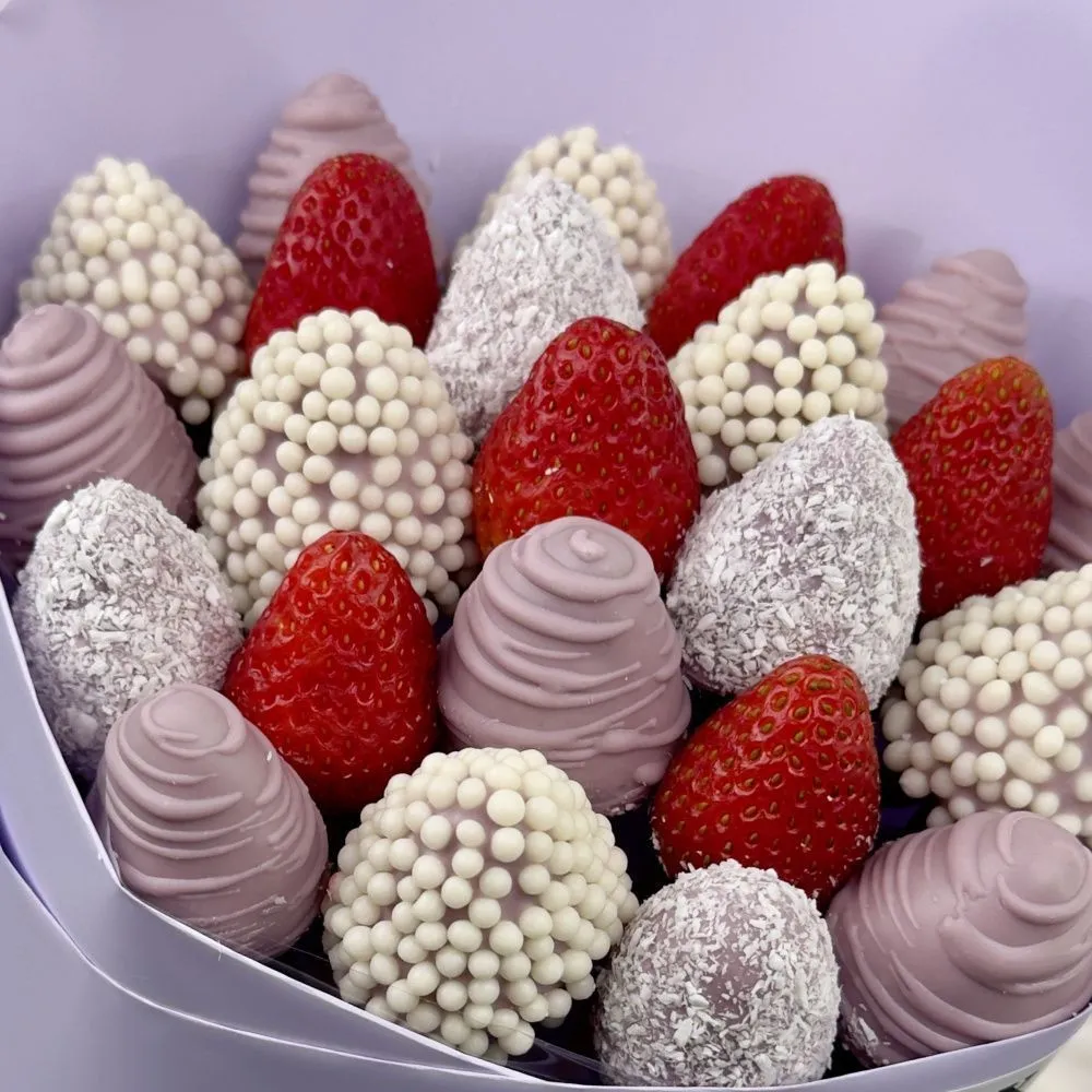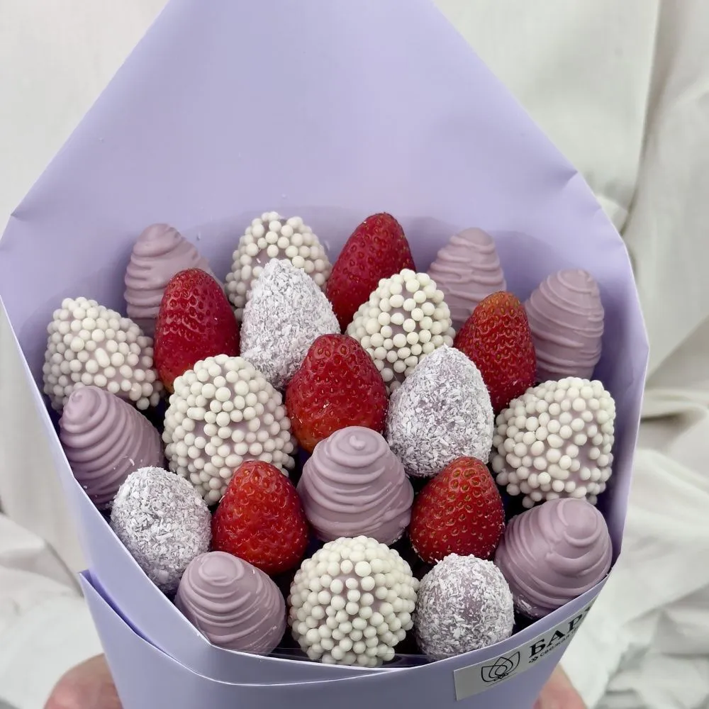 Мы собираем клубничные букеты по весу, а не по штукам. Количество, форма и размер ягод могут отличаться — ведь каждая ягода уникальна.