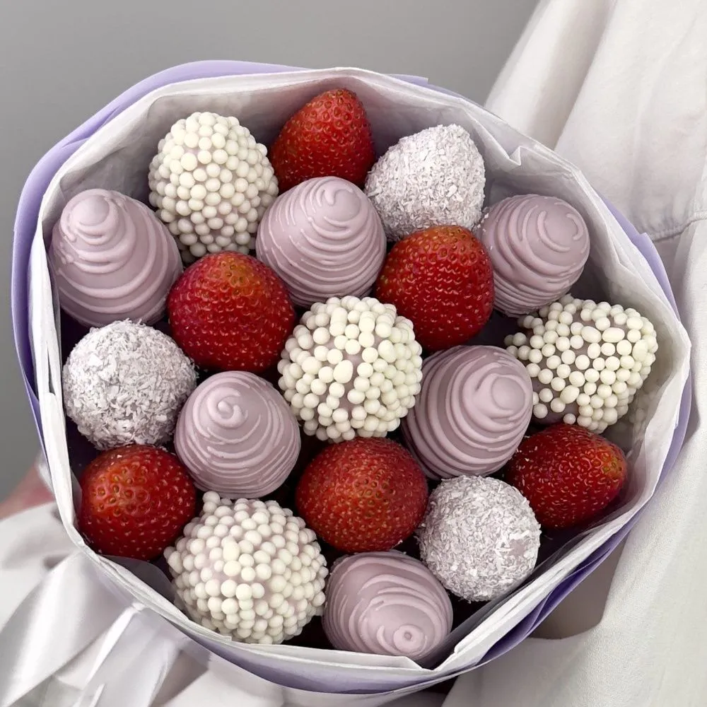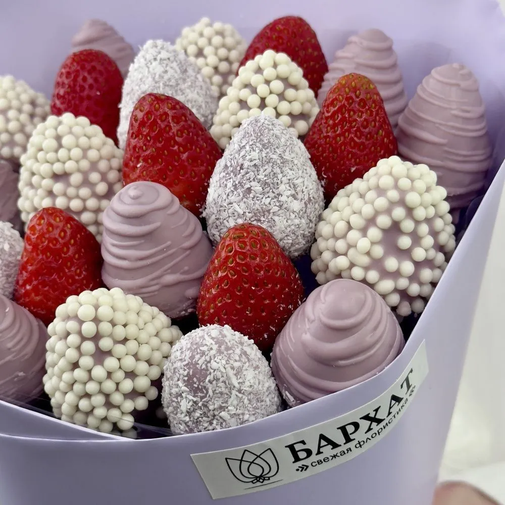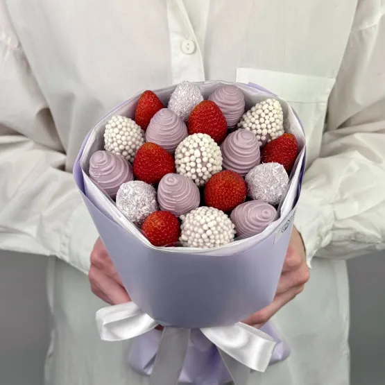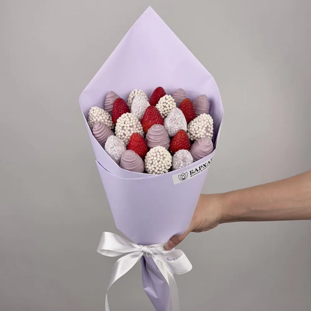 Состав: клубника в шоколаде 150 г, клубника без шоколада 150 г, Букет из свежей клубники в бельгийском шоколаде. Клубника держится на каркасе из шпажек. Готовый букет упаковывается в прозрачную слюду. Фирменная открытка-инструкция по хранению — в подарок. Этот букет — идеальный способ выразить чувства: ко дню рождения, годовщине, 8 Марта, 14 Февраля, Дню матери, Дню учителя, Дню бабушки и дедушки или просто в знак внимания и заботы. Букет из клубники — съедобный букет — отличный подарок бабушке, маме, любимой женщине, жене, подруге, сестре, друзьям и коллеге.