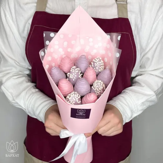 Мы собираем клубничные букеты по весу, а не по штукам. Количество, форма и размер ягод могут отличаться — ведь каждая ягода уникальна.