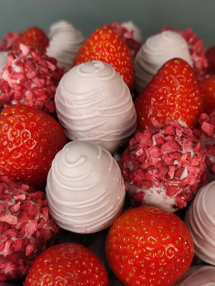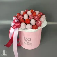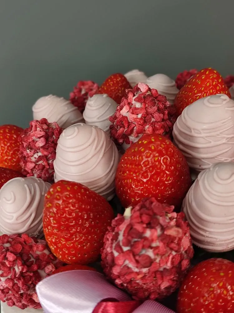 Мы собираем клубничные букеты по весу, а не по штукам. Количество, форма и размер ягод могут отличаться — ведь каждая ягода уникальна.