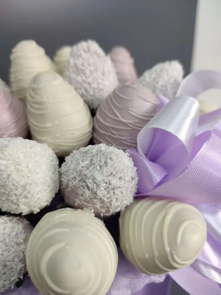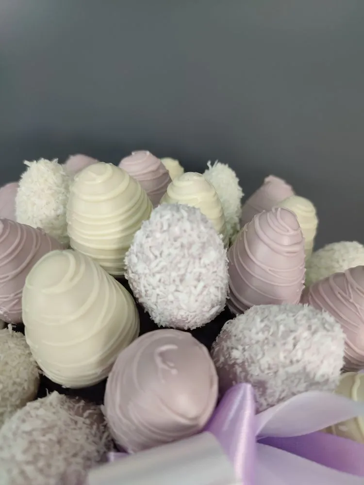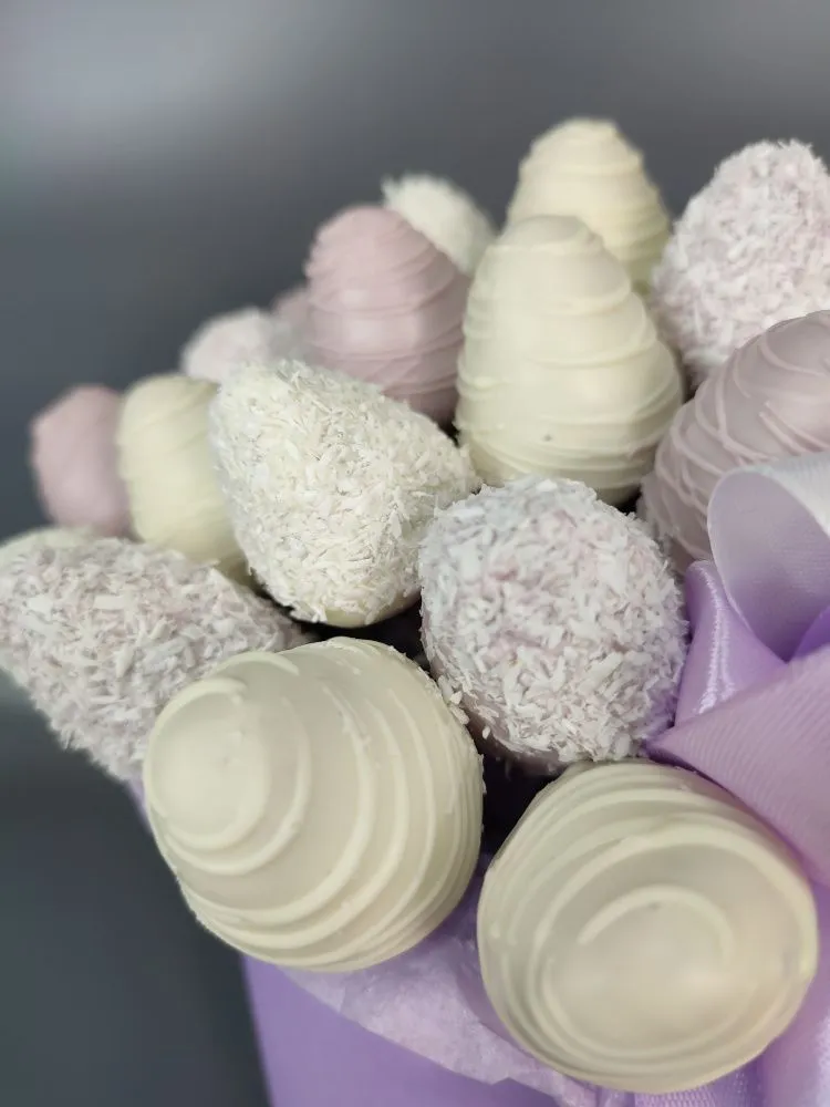 Мы собираем клубничные букеты по весу, а не по штукам. Количество, форма и размер ягод могут отличаться — ведь каждая ягода уникальна.