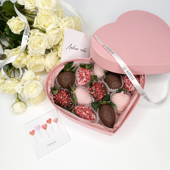 Этот набор — двойной сюрприз для особых моментов. В нём сочетаются свежие цветы и коробочка розовое сердце с изысканным десертом: клубникой сорта Альбион в фирменном шоколаде с различными посыпками. Идеальный выбор для трогательного признания на 14 февраля (День Святого Валентина), День рождения, 8 Марта, годовщину или без повода. Он создаёт незабываемое впечатление, говоря о ваших чувствах сразу двумя способами. Это роскошный и вкусный сюрприз для любимой женщины, девушки, жены, мамы, подруги или коллеги. В комплект входит бесплатная уникальная открытка на плотной бумаге с милой иллюстрацией, на обороте которой можно оставить свои слова. Свежий букет и сочные ягоды клубники в шоколаде — для ваших самых важных людей.