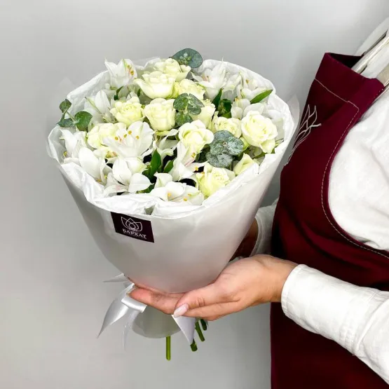 Мы стараемся собрать букет максимально похожим на фото. Возможны небольшие отличия в оттенках.