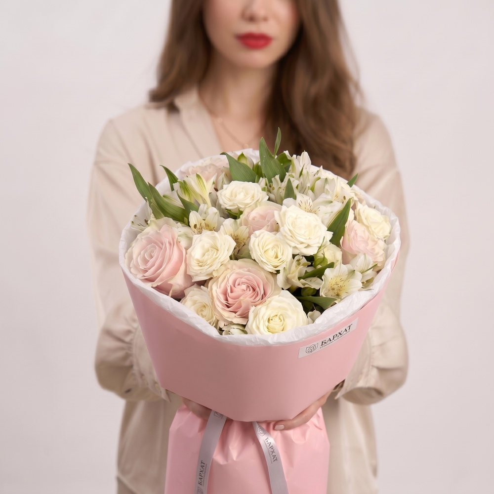Состав: роза одноголовая розовая 7 шт., роза кустовая белая 2 шт., альстромерия белая 5 шт.