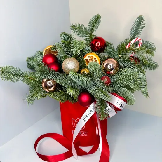 Эта праздничная композиция соединила в себе свежий аромат пушистого нобилиса и сияние новогодних украшений. Цветы стоят во флористической губке, которая сохранит безупречный вид и свежесть ветвей. Миниатюрные подарки, мерцающие шары и хвойные ветви создают законченный образ праздника, дарящий уют и настоящее зимнее настроение. Идеальное решение для тех, кто ценит время и стиль! Эта композиция — готовый новогодний декор для дома или офиса. Она станет изумительным подарком на Новый год и Рождество для близких, друзей, коллег или партнёров. Поставьте коробку на праздничный стол, комод или каминную полку — и атмосфера торжества поселится с вами. Подарите не просто вещь, а ощущение чуда и внимание к деталям. Чтобы продлить жизнь композиции, можно изредка увлажнять губку у основания небольшим количеством воды.