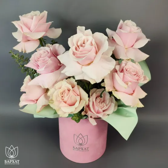 Состав: роза одноголовая 9 шт., эвкалипт 3 шт.  Композиция из цветов, выполненная в фирменном боксе. Цветы стоят на флористической губке. Букет в брендированной коробке — идеальный способ выразить чувства: ко дню рождения, годовщине, 8 Марта, 14 Февраля, Дню матери, Дню учителя, Дню бабушки и дедушки или просто в знак внимания и заботы. Фирменная открытка-инструкция по хранению — в подарок. Цветы в боксе — отличный подарок бабушке, маме, любимой женщине, жене, подруге, сестре, друзьям и коллеге.