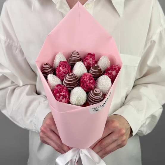*Обратите внимание: изображение в карточке товара носит иллюстративный характер — реальный букет может незначительно отличаться от фото (например, по размеру клубники, форме и сборке). Точные размеры букета указаны в карточке товара.