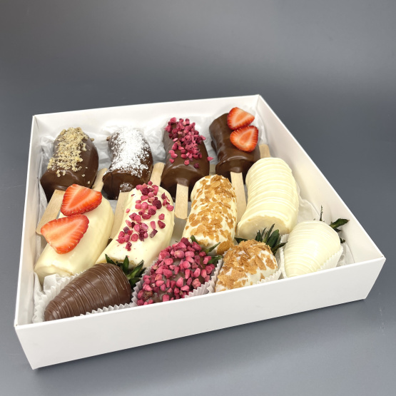 Состав: бананы в шоколаде 8 шт., клубника в шоколаде 4 шт.